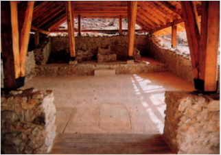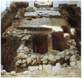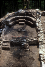 V severni cerkvi so stopnice vodile iz ladje v prezbiterij. Na pregrado je bila prizidana prižnica, v osrednjem delu je stal oltar, ob vzhodnem zidu pa klop za duhovščino s škofovskim sedežem v sredini. © 1996, Slavko Ciglenečki, vir: Inštitut za arheologijo ZRC SAZU.