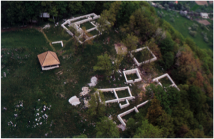 Na zračnem posnetku so vidni tlorisi stanovanjskih hiš, vodni zbiralnik in večja cerkev. © 1999, Jože Hanc, vir: Zakladi tisočletij (Ljubljana 1999).