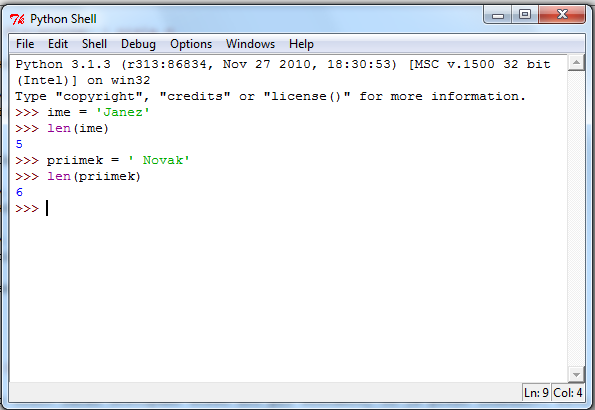 Dolžino niza dobimo s funkcijo len. Len prešteje tudi presledke.