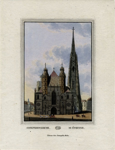 Joseph in Eduard Gurk, S. v. Perger in J. Lutz: Wien' s vorzüglichste Gebäude und Monumente: St. Stephans-kirche (Dunajske odlične stavbe in spomeniki: Cerkev sv. Štefana), barvna litografija, 1823