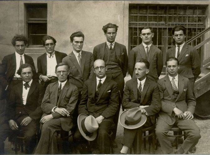 Slovensko umetniško društvo v Ljubljani (bivši "Klub mladih") ob svoji XV. razstavi v Ljubljani septembra 1926 (v prvi vrsti od leve proti desni: France Kralj, Tine Kos, Fran Zupan, Gojmir Anton Kos, Fran Stiplovšek; v drugi vrsti od leve proti desni: Tone Kralj, Ivan Čargo, Nande Vidmar, Marjan Mušič, Drago Vidmar, Domicijan Serajnik), fotografija