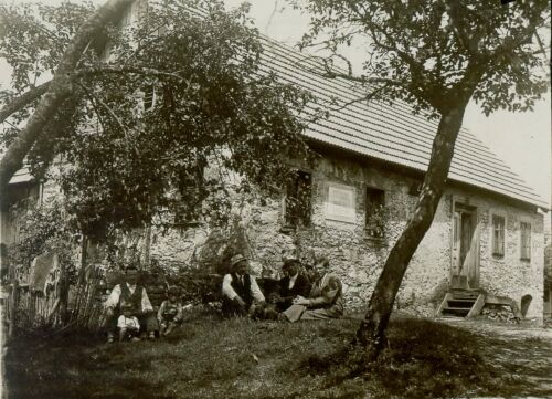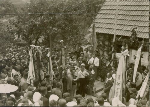 Proslava 100-letnice Levstikovega rojstva pred njegovo rojstno hišo 26. julija 1931 (govori Vl. Levstik, med gosti na desni spodaj A. Šerko, Fr. Jeran, J. Pikenbaher), fotografija