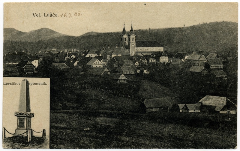 Na razglednicah Velikih Lašč najpogosteje zasledimo cerkev Marijinega rojstva. Z gradnjo nove cerkve so začeli leta 1856, saj je bila stara premajhna. Triladijska cerkev je zgrajena v novoromanskem slogu z dvema osemintrideset metrov visokima zvonikoma. Leta 1899 so v Velikih Laščah pred cerkvijo postavili spomenik Franu Levstiku, ki ga je naredil domačin Franc Jontez. Valentin Vodnik in Fran Levstik sta namreč leta 1899 kot prva Slovenca dobila spomeniški kip. Kip posvečen Levstiku je oblikovno manj zahteven, saj se Jontez ni ukvarjal s figuro, ampak je naredil obelisk. Leta 1931, ob 100-letnici Levstikovega rojstva, so na obelisk dodali medaljon z njegovim portretom iz profila, ki je delo kiparja Svitoslava Peruzzija. Istega leta je izšla z motivom Peruzzijevega medaljona razglednica. 26. julija leta 1931 je potekala pred Levstikovo rojstno hišo tudi proslava. Rojstna hiša danes ni več ohranjena. Na sedanji hiši je spominska plošča ter Levstikov portret.