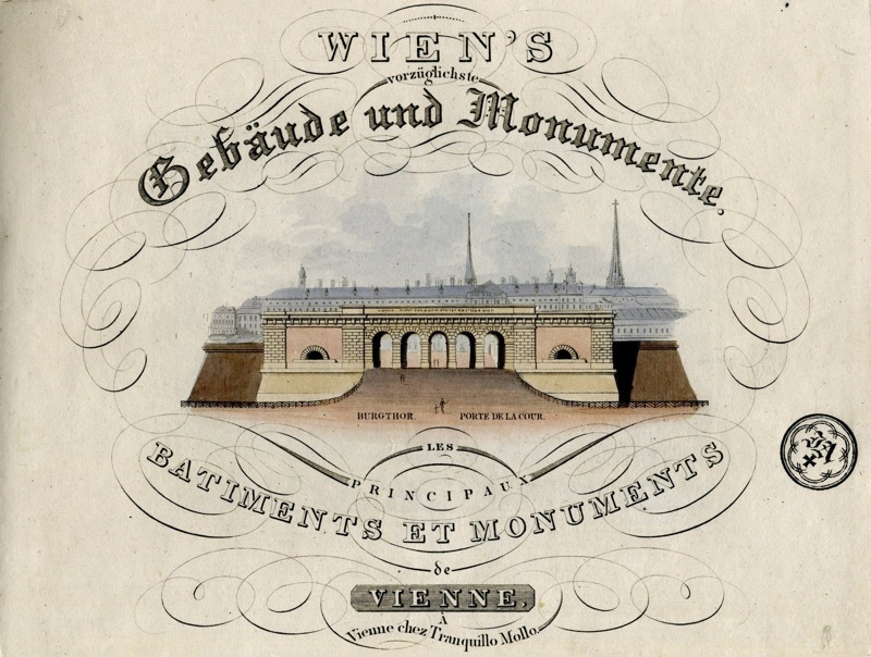 Joseph in Eduard Gurk, S. v. Perger in J. Lutz: Wien' s vorzüglichste Gebäude und Monumente (naslovnica iz albuma Dunajske odlične stavbe in spomeniki), barvna litografija, 1823
