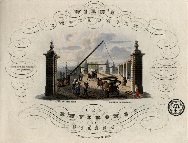 Joseph in Eduard Gurk: Wien's Umgebungen: Maria-Hülfer Linie (naslovnica iz albuma Dunaj in okolica), barvna litografija, 1827