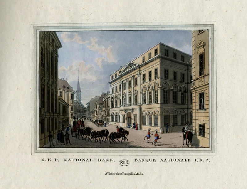 Joseph in Eduard Gurk, S. v. Perger in J. Lutz: Wien' s vorzüglichste Gebäude und Monumente: K.K.P. National-bank (album Dunajske odlične stavbe in spomeniki: Cesarsko kraljeva privilegirana nacionalna banka), barvna litografija, 1823