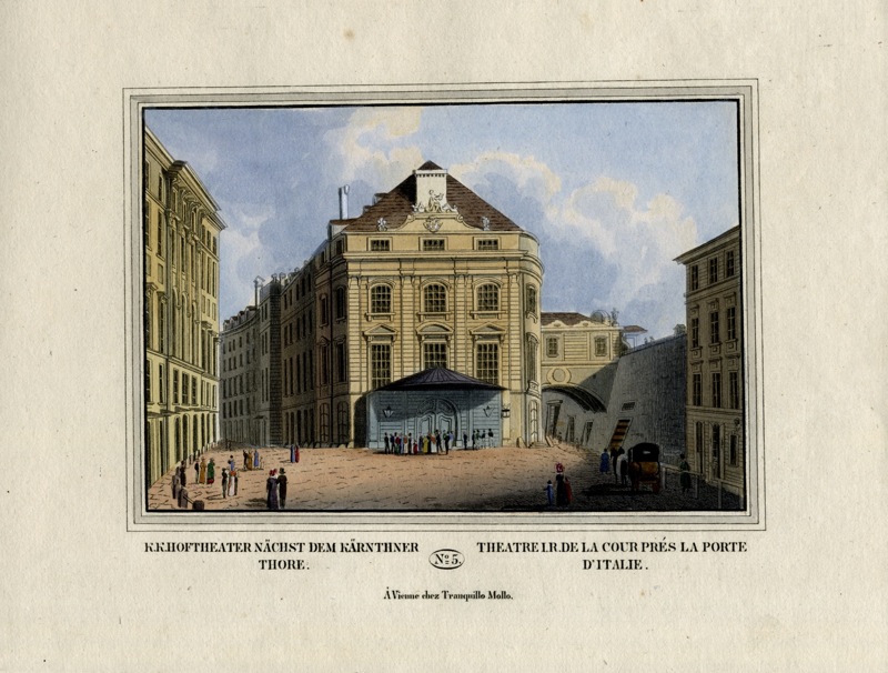 Joseph in Eduard Gurk, S. v. Perger in J. Lutz: Wien' s vorzüglichste Gebäude und Monumente: K.K. Hoftheater nächst dem Kärnthner Thore (album Dunajske odlične stavbe in spomeniki: Cesarsko kraljevo dvorno gledališče ob Koroških vratih), barvna litografija, 1823