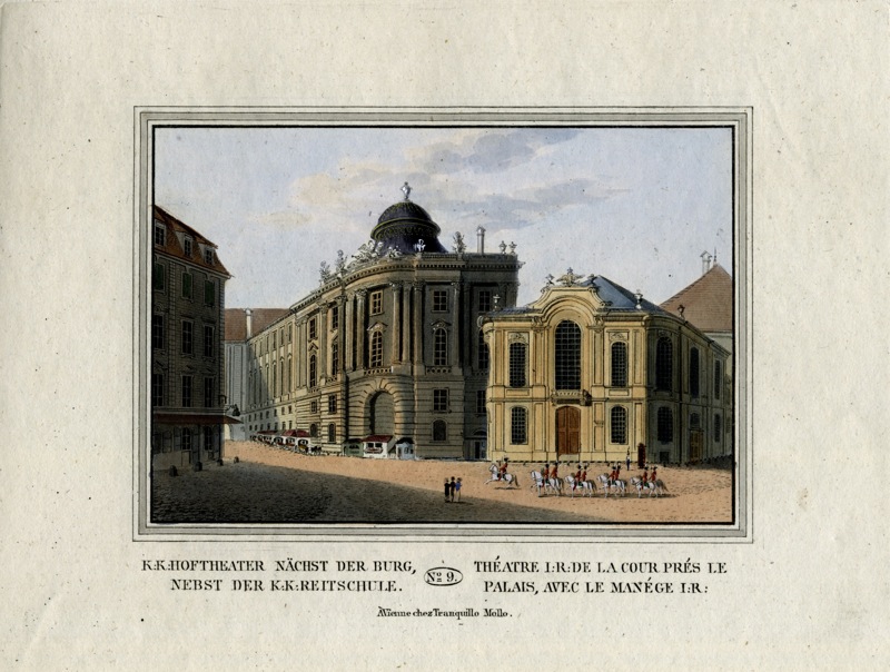 Joseph in Eduard Gurk, S. v. Perger in J. Lutz: Wien' s vorzüglichste Gebäude und Monumente: K.K. Hoftheater nächst der Burg nebst der K.K. Reitschule (Dunajske odlične stavbe in spomeniki: Cesarsko kraljevo dvorno gledališče ob gradu, poleg cesarsko kraljeve jahalne šole), barvna litografija, 1823