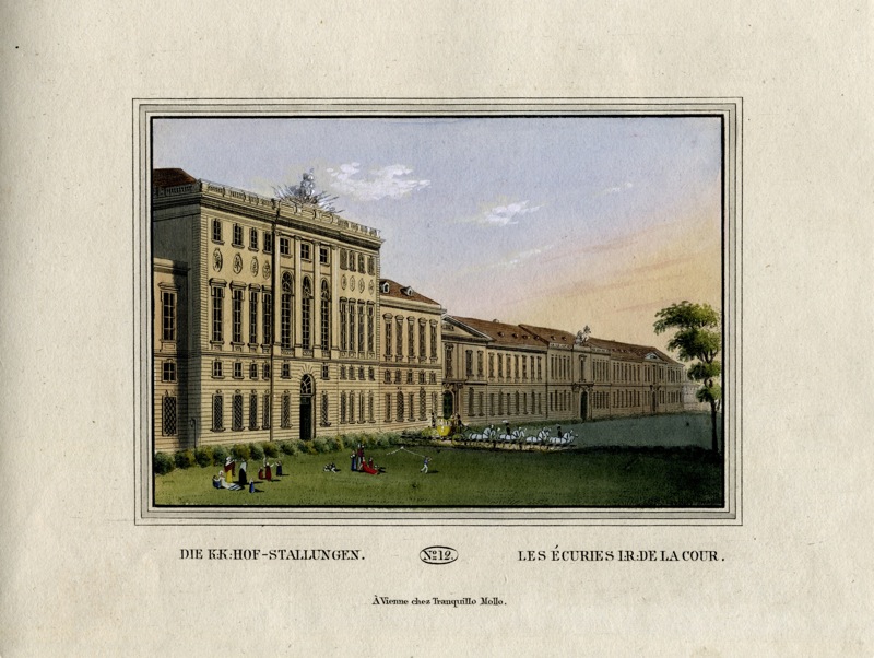 Joseph in Eduard Gurk, S. v. Perger in J. Lutz: Wien' s vorzüglichste Gebäude und Monumente: Die K.K. Hof-stallungen (Dunajske odlične stavbe in spomeniki: Cesarsko kraljeva dvorna konjušnica), barvna litografija, 1823