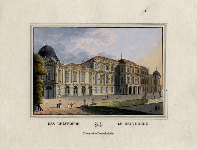 Joseph in Eduard Gurk, S. v. Perger in J. Lutz: Wien' s vorzüglichste Gebäude und Monumente: Das Belvedere (Dunajske odlične stavbe in spomeniki: Belvedere), barvna litografija, 1823