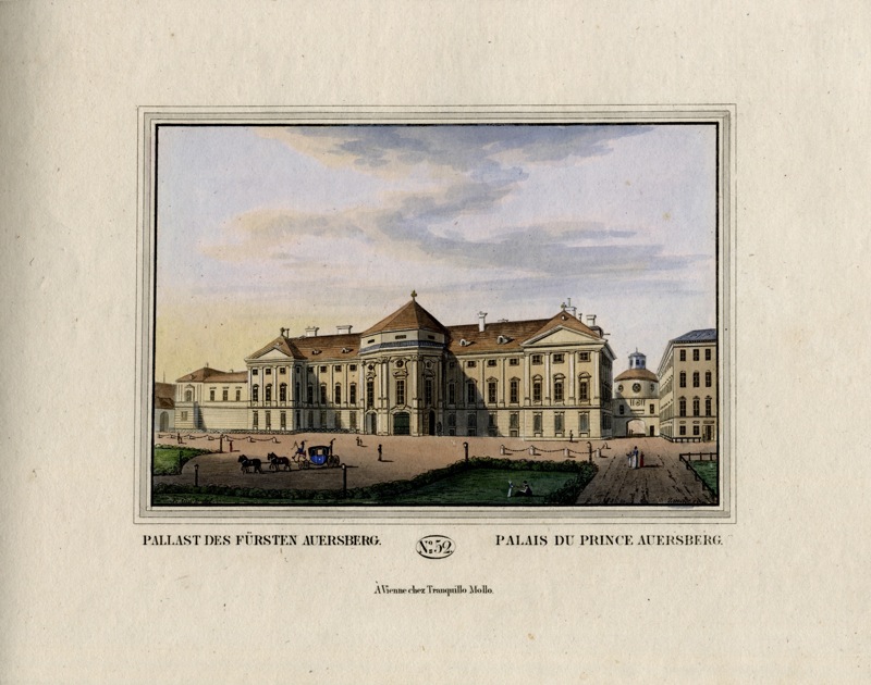 Joseph in Eduard Gurk, S. v. Perger in J. Lutz: Wien' s vorzüglichste Gebäude und Monumente: Pallast des Fürsten Auersberg (Dunajske odlične stavbe in spomeniki: Palača kneza Auersperga), barvna litografija, 1823