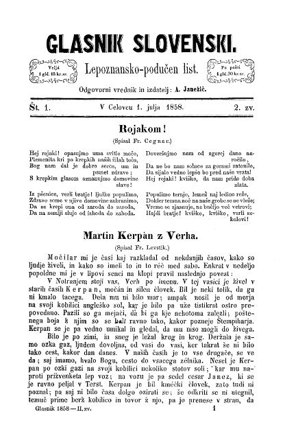 Prva objava Levstikovega Martina Krpana v Slovenskem glasniku leta 1858 (1. del: 1–1, 1–6; 2. del: 1–2, 25–31. Celovec. [COBISS-ID 31648769])