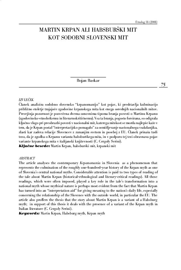 Baskar, B. 2008: Martin Krpan ali habsburški mit kot sodobni slovenski mit. Etnolog, 18–69, 75–93. Ljubljana. [COBISS-ID 30616065])