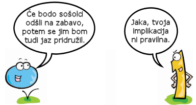 Implikacija je nepravilna samo v primeru, ko iz pravilne predpostavke sledi nepravilna posledica. Če sklepamo iz nepravilne predpostavke, potem je v vsakem primeru pravilna.