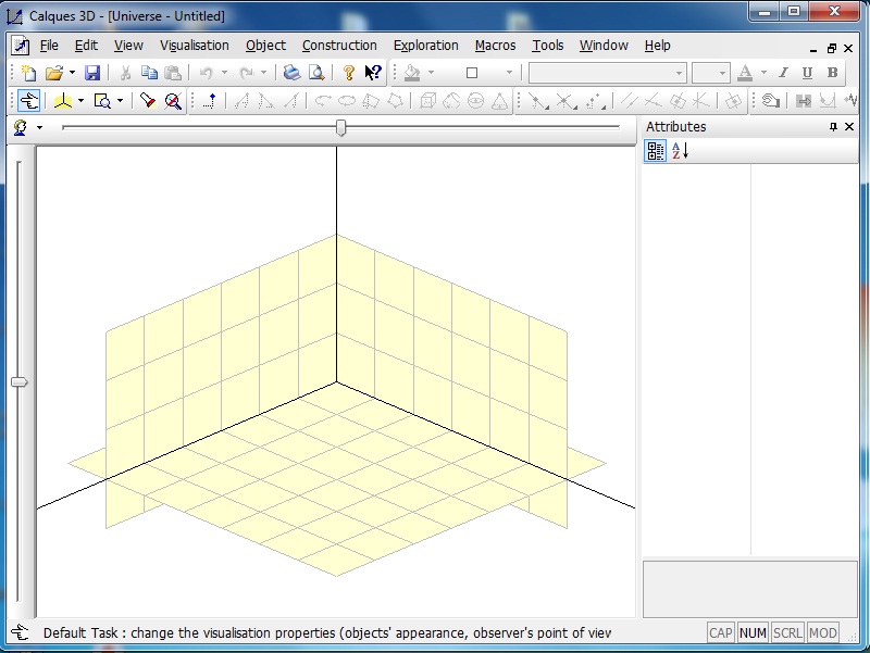 • Prvi je univerzalni delovni list v katerem konstruiramo. Ko imamo nekaj skonstruirano, lahko s pomočjo drsnika (eden je skrajno levo, drugi pa pod orodno vrstico) opazujemo z različnih zornih kotov. To nam omogoča boljše razumevanje in opazovanje tridimenzionalnih konstrukcij. Seveda pa lahko objektu spreminjamo lastnosti, tako da kliknemo nanj in se nam skrajno desno v "algebrskem" oknu pojavijo lastnosti objekta. Spreminjamo lahko ime, barvo, obliko, vidnost in označenost.