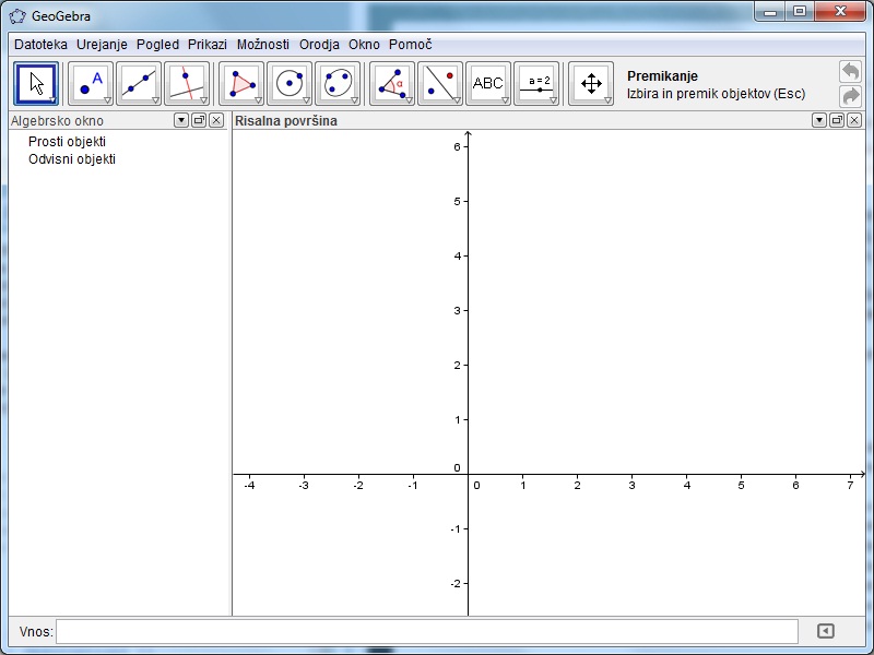 S tem orodjem označimo željeno konstrukcijo. na desni strani v algebrskem oknu se nam pokažejo osnovne lastnosti označenega objekta in te lahko tudi spreminjamo.