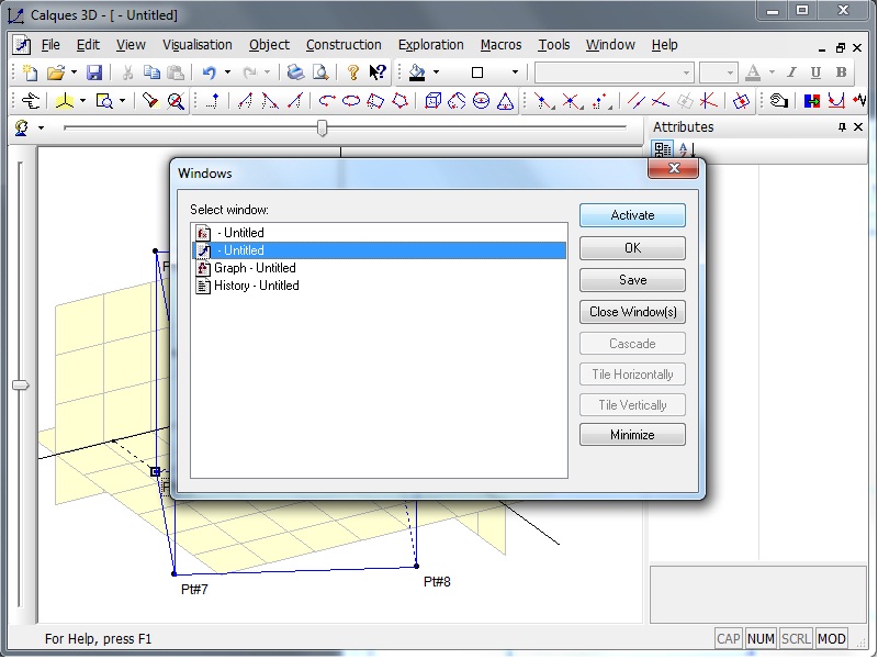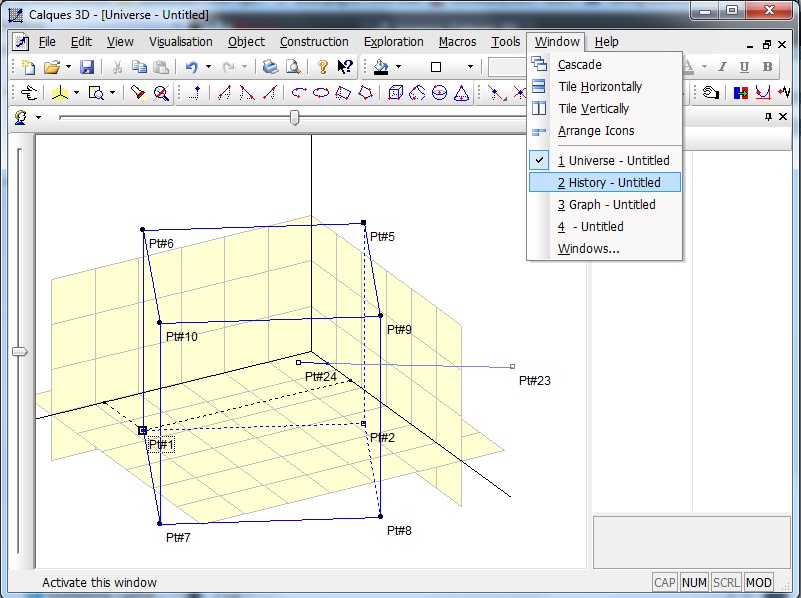 • Calques 3D ima zgodovinsko okno, ki pa je podobno oknu Opis konstrukcij v GeoGebri